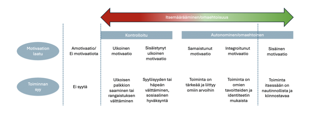 Kuten huomata saattaa, motivaatio ei ole mustavalkoinen ja suoraviivainen määre, vaan erittäin kompleksi ja monitasoinen psykologinen ilmiö. Alla oleva kuva 1 tiivistää ajatuksen itsemääräämisen jatkumosta motivaation laadun perustana.